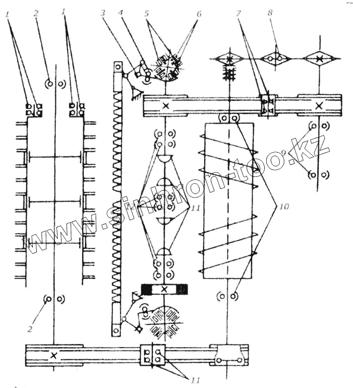 Схема расположения ремней и цепей жатки для уборки кукурузы