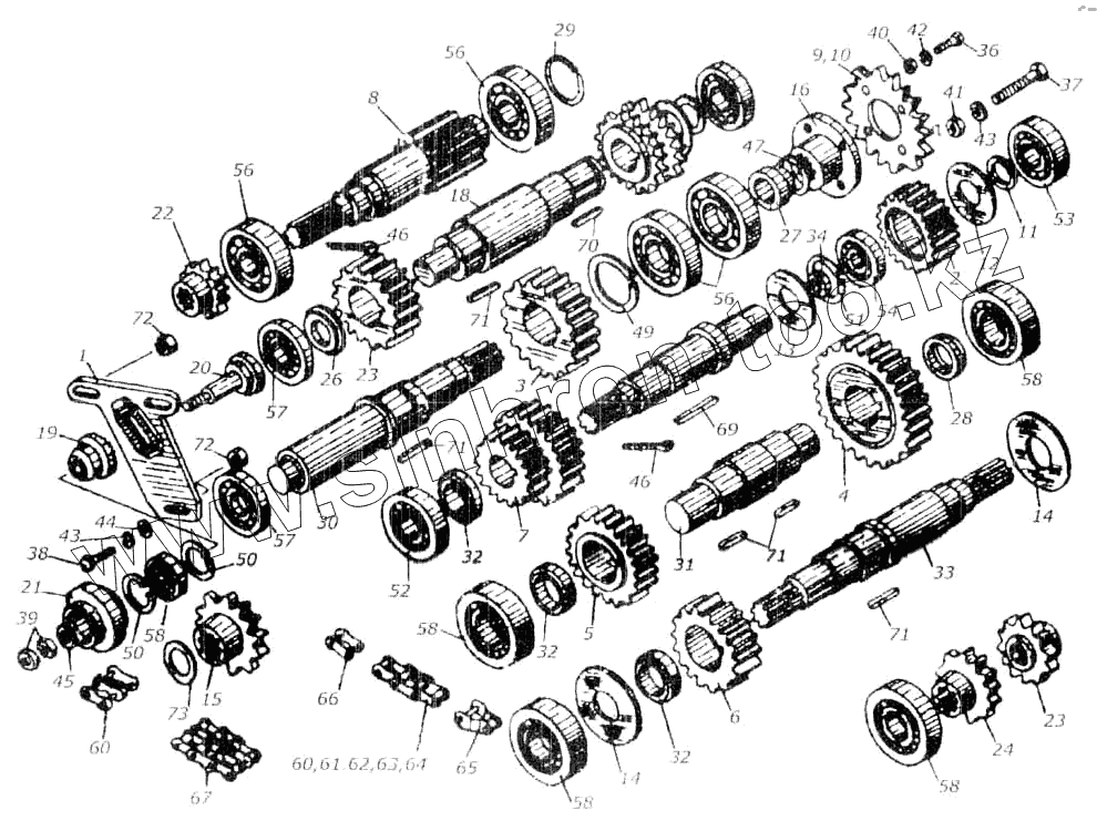 Каталог запасных частей к технике: Гомсельмаш КСК-100А. Валы и шестерни КПП КИЛ 0114000