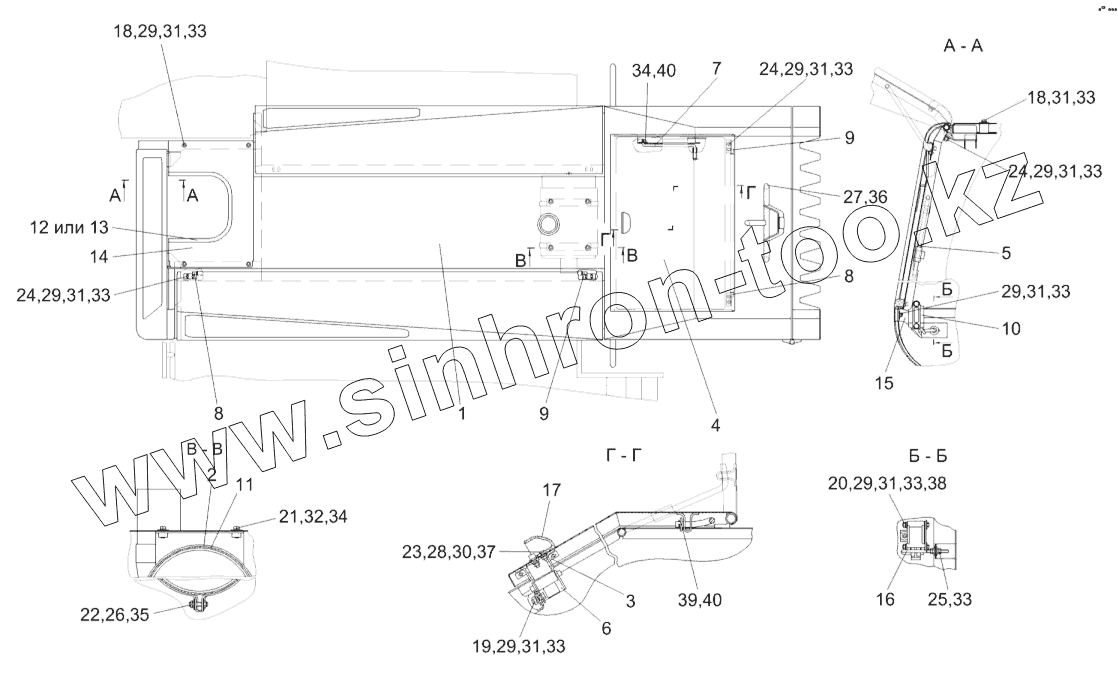 Каталог запасных частей к технике: Гомсельмаш КСК-600. Установка капотов КГС 0128000 (вид сверху)