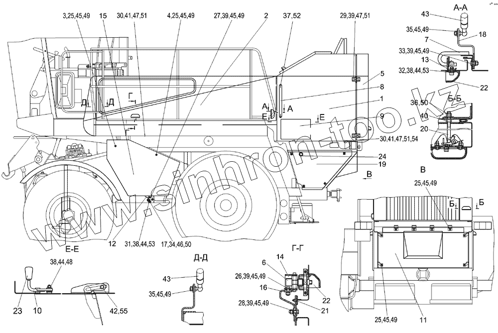 Каталог запасных частей к технике: Гомсельмаш КСК-600. Установка капотов КГС 0128000 (вид слева)