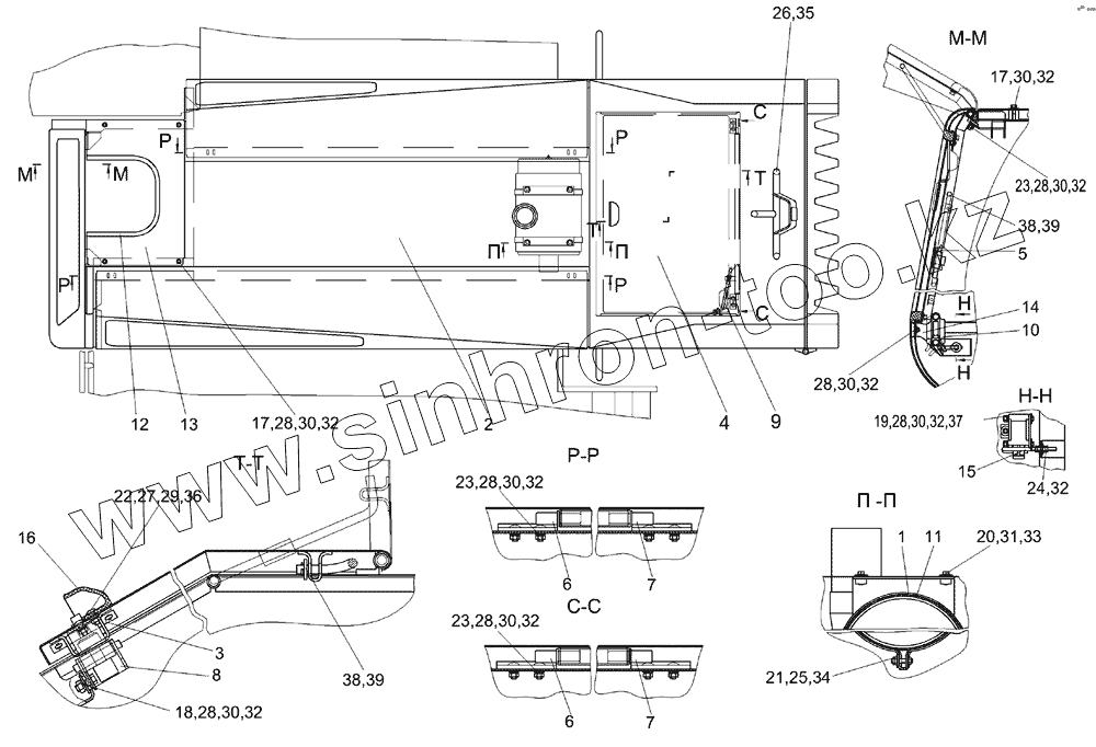 Каталог запасных частей к технике: Гомсельмаш КСК-600. Установка капотов КГС 0128000 (вид сверху)