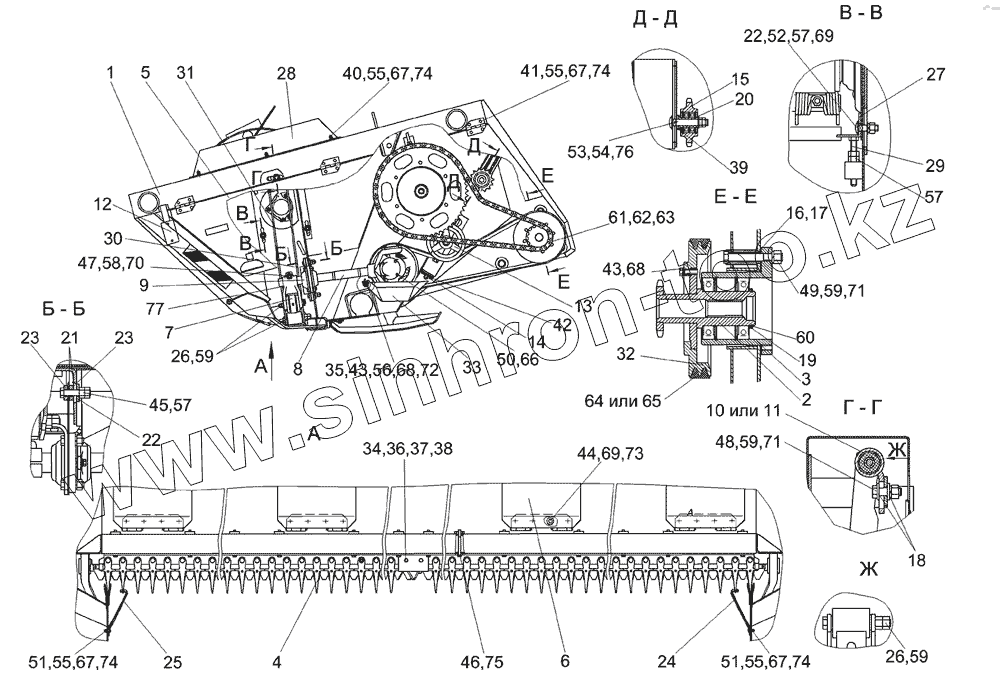 Каталог запасных частей к технике: Гомсельмаш КСК-600. Жатка для трав КГС 0200000 (вид слева)