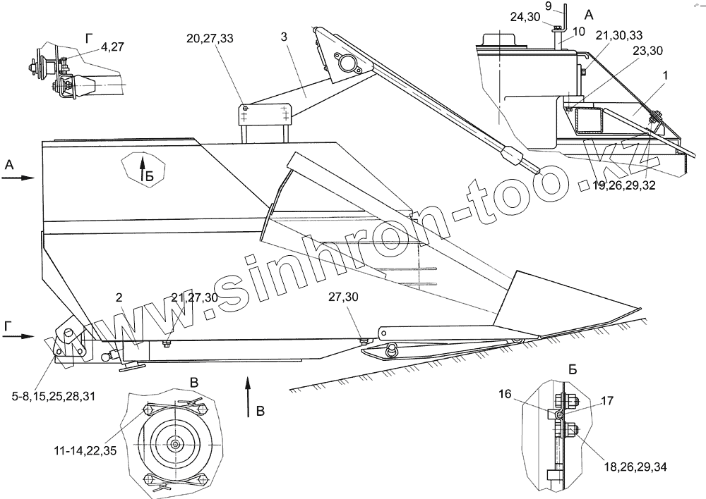 Каталог запасных частей к технике: Гомсельмаш КСК-600. Жатка КГС 0800010 (вид сбоку)