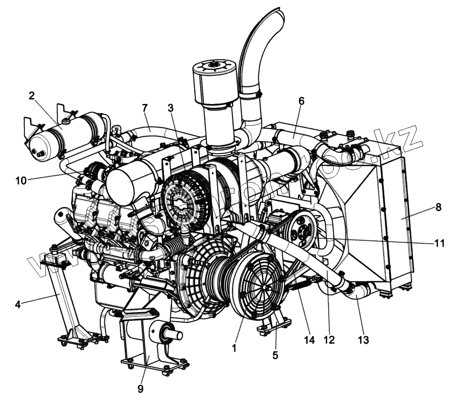 Каталог запасных частей к технике: Гомсельмаш КВК-6025. Установка двигателя КСК-6025-0116000 (общий вид)