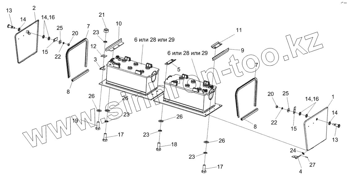 Каталог запасных частей к технике: Гомсельмаш КВК-800 (FS80-2). Установка аккумуляторов КВС-2-0101020