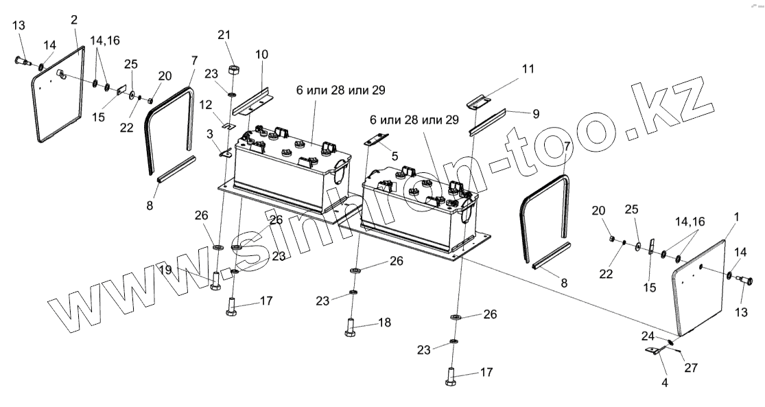 Каталог запасных частей к технике: Гомсельмаш КВК-800 (FS80-5). Установка аккумуляторов КВС-2-0101020