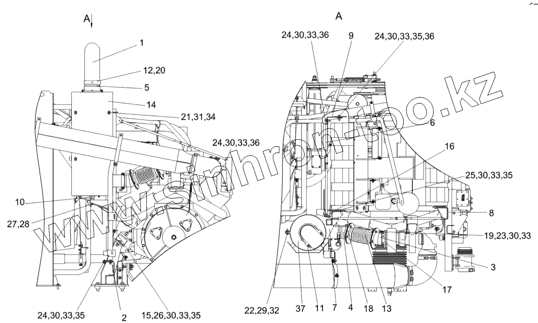 Каталог запасных частей к технике: Гомсельмаш КВК-800 (FS80-5). Установка глушителя КВС-5-0157100