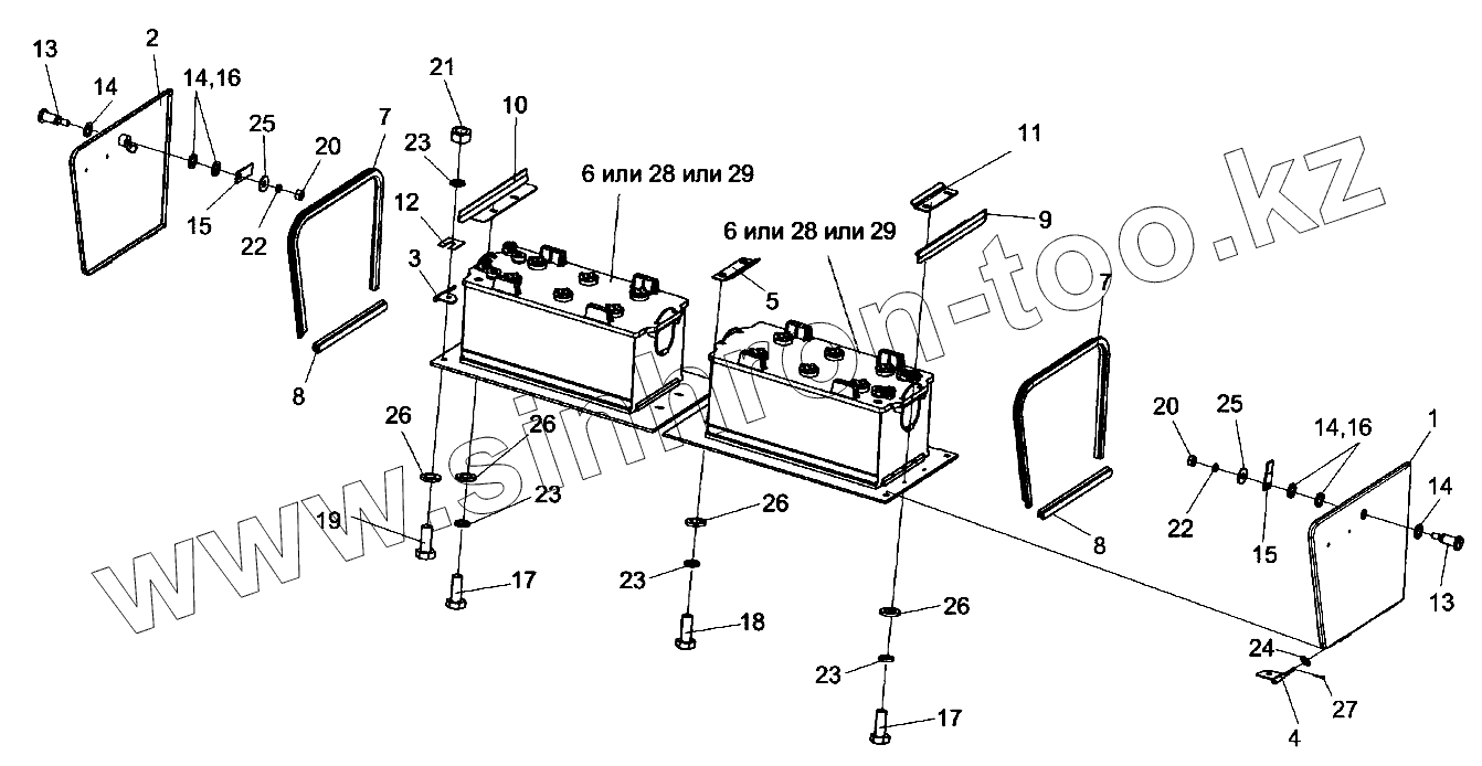 Каталог запасных частей к технике: Гомсельмаш КВК-800 (FS80-7). Установка аккумуляторов КВС-2-0101020