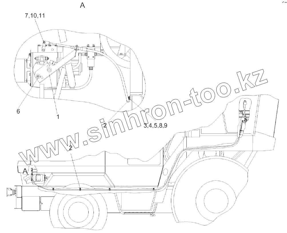 Гидросистема привода питающего аппарата и адаптеров комбайна КВК-800-16 КВС-2-0604000Б (вид сбоку)