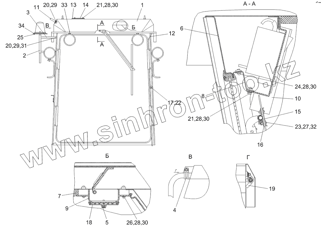 Каталог запасных частей к технике: Гомсельмаш КЗС-7. Кабина КЗК 0120000 (вид спереди)