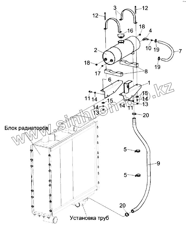 Каталог запасных частей к технике: Гомсельмаш KЗС-812. Установка бачка расширительного КЗК-8К-0106070