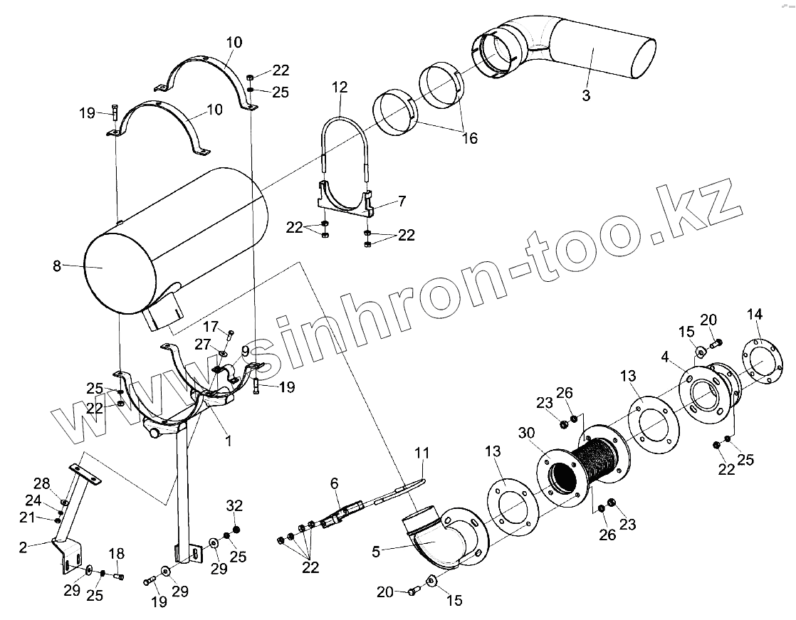 Каталог запасных частей к технике: Гомсельмаш KЗС-812. Установка глушителя КЗК-8К-0106060
