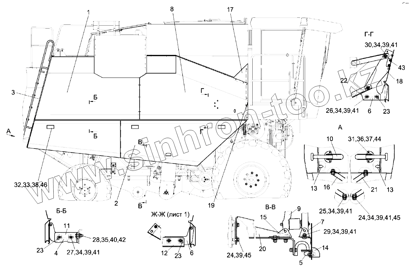 Каталог запасных частей к технике: Гомсельмаш KЗС-812. Установка капотов и ограждений КЗК-8А-0128000-03
