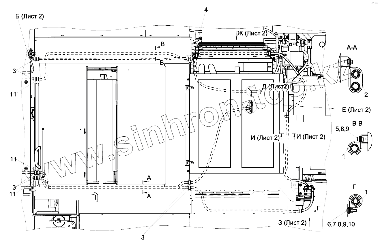 Гидросистема рулевого управления и силовых гидроцилиндров КЗК-8А-2-0602000 (вид справа)