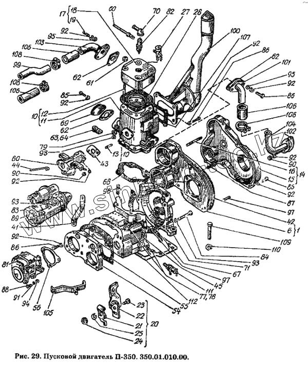 Каталог запасных частей к технике: ХТЗ Т-150К. Пусковой двигатель П-350. 350.01.010.00