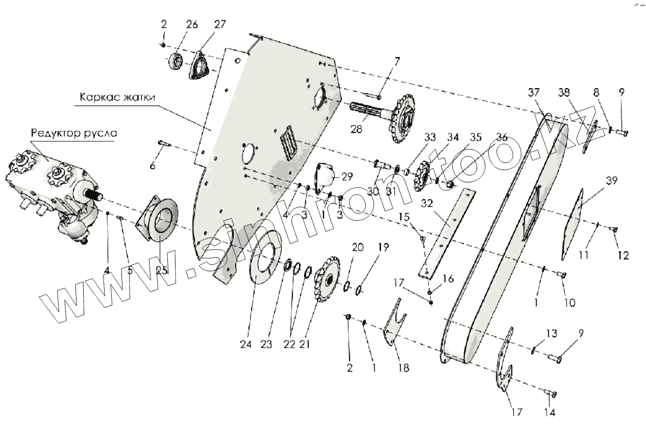 Каталог запасных частей к технике: Клевер ППК-82 "Argus". Привод жатки (вид слева)