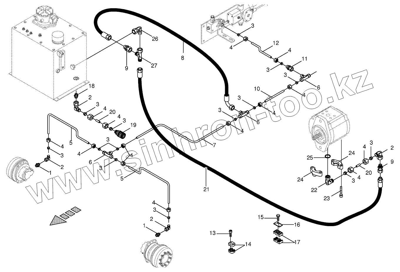Каталог запасных частей к технике: KRONE BIG-M-I. Hydr.ground drive/front leakage oil line