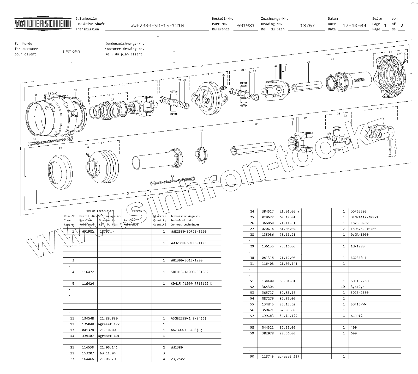 Каталог запасных частей к технике: Lemken Primus 10 (Часть 1). R001127 Cardan shaft