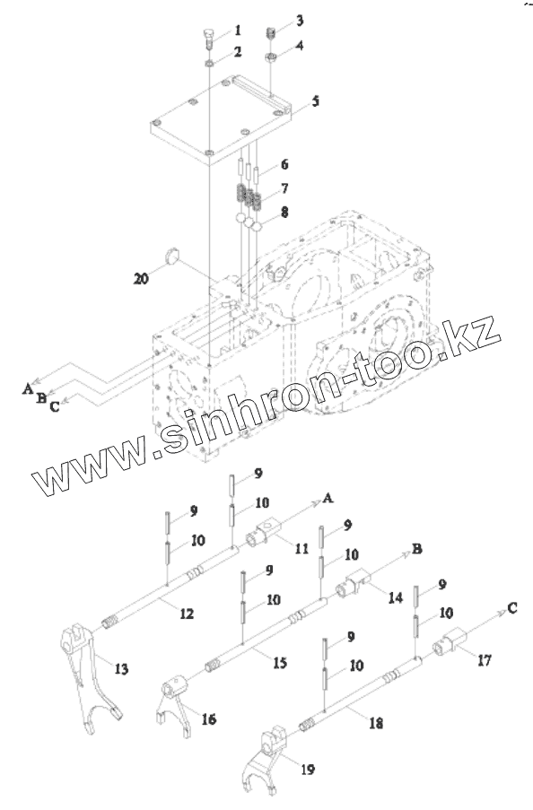 Каталог запасных частей к технике: Lovol TE-354. TRANSMISSION CASE CONTROL MECHANISM ASSEMBLY-2