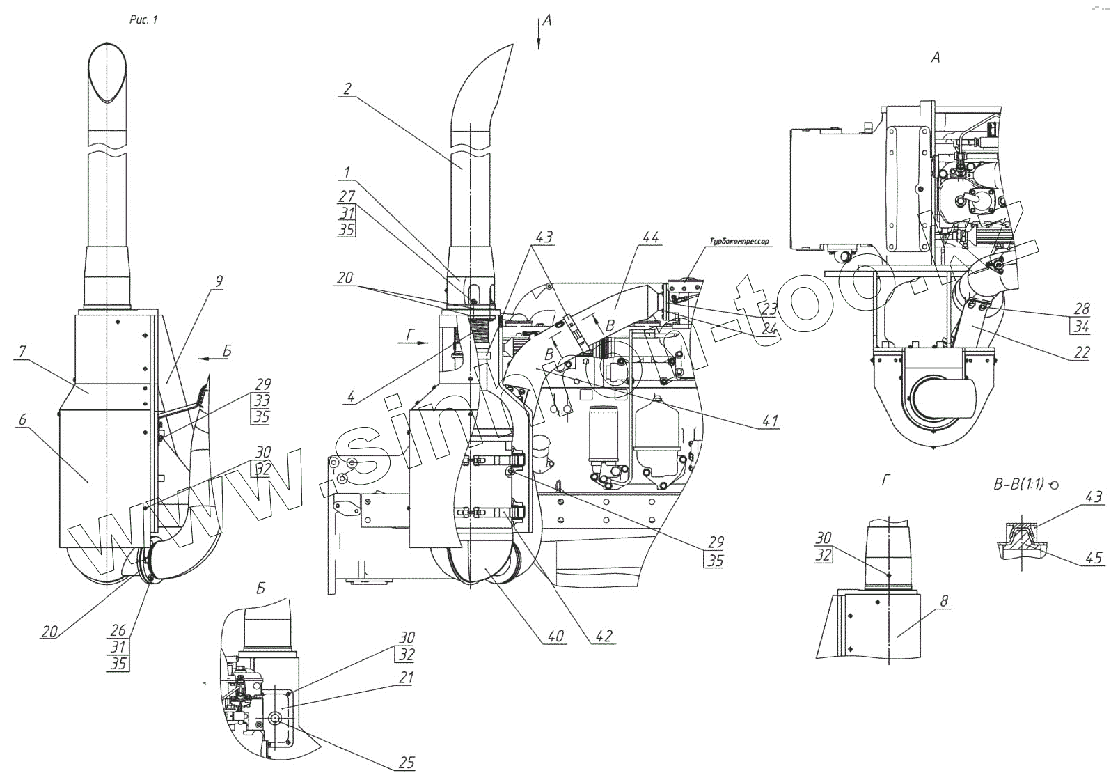 Каталог запасных частей к технике: МТЗ 1523.5. Установка глушителя