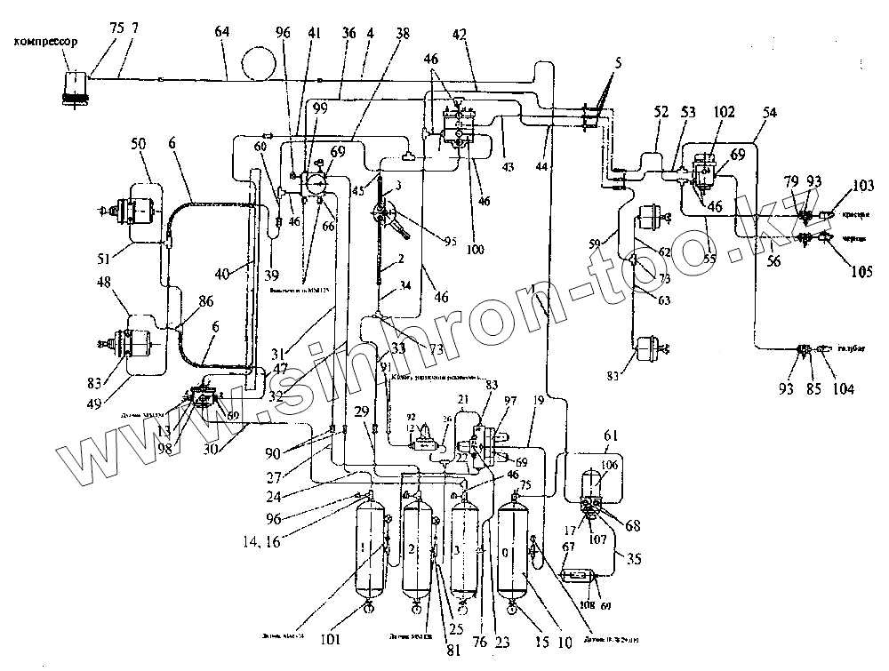 Каталог запасных частей к технике: ПТЗ K-744P1. Схема пневматическая соединений тормозной системы