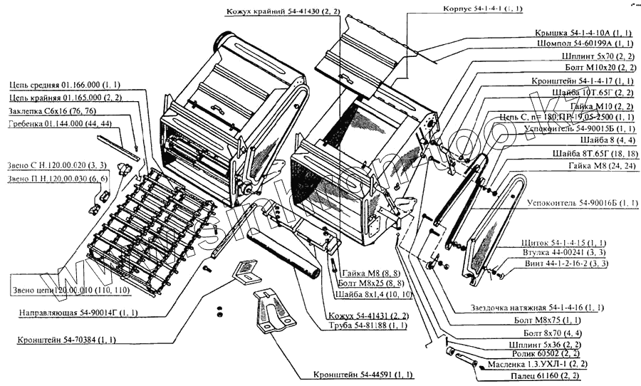 Схема расположения клиновых ремней, цепей, натяжных шкивов и звездочек на левой стороне комбайнов