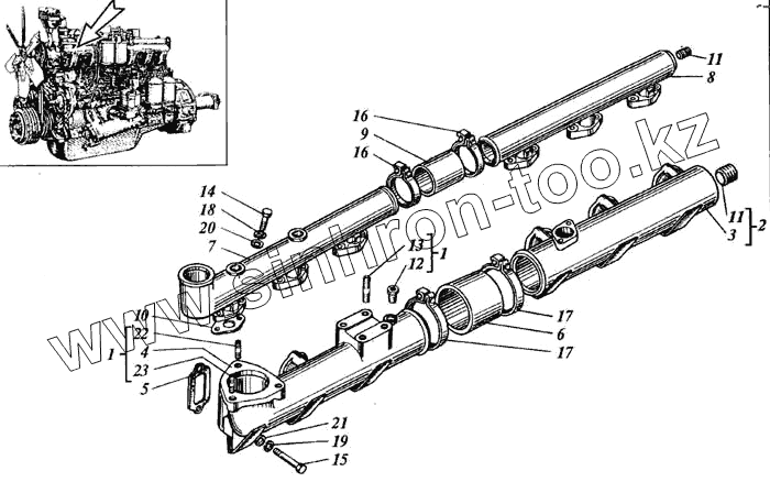 Каталог запасных частей к технике: РСМ Дон 1500А. Труба водяная и коллектор впускной