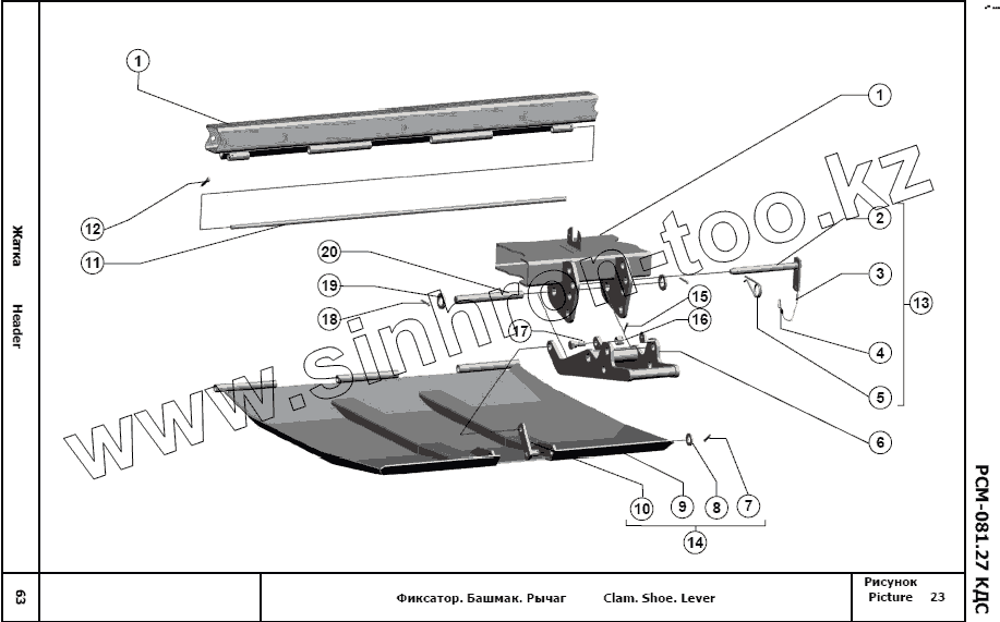 Каталог запасных частей к технике: РСМ Жатка РСМ-081.27. Фиксатор. Башмак. Рычаг
