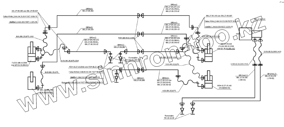 Каталог запасных частей к технике: РСМ Жатка РСМ-081.27. Гидросистема жатки 5 м. Схема соединений