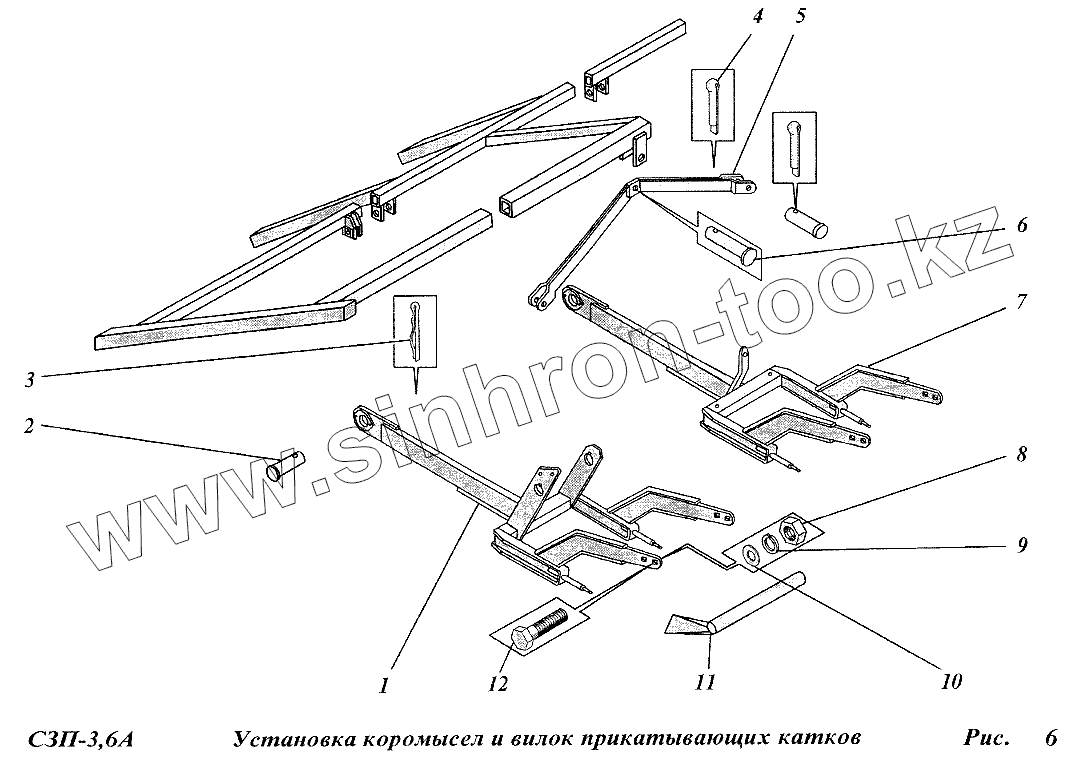 Каталог запасных частей к технике: Сибсельмаш СЗП-3,6А. Установка коромысел и вилок прикатывающих катков