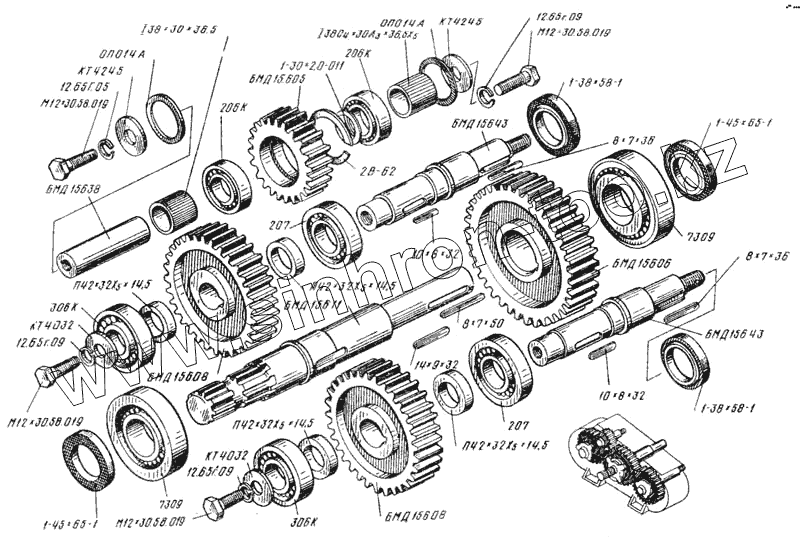 Каталог запасных частей к технике: ТеКЗ БМ-6А. Редуктор центральный. Валы и шестерни