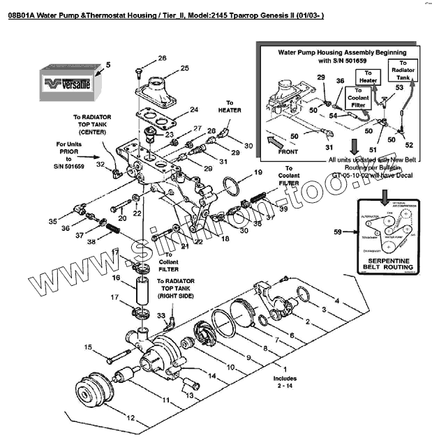 Каталог запасных частей к технике: Versatile серии GENESIS. 08B01A Водяной насос и термостат