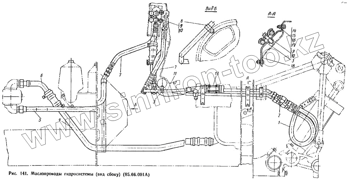 Каталог запасных частей к технике: ВгТЗ ДТ-75М. Маслопроводы гидросистемы (вид сбоку) (85.66.001А)