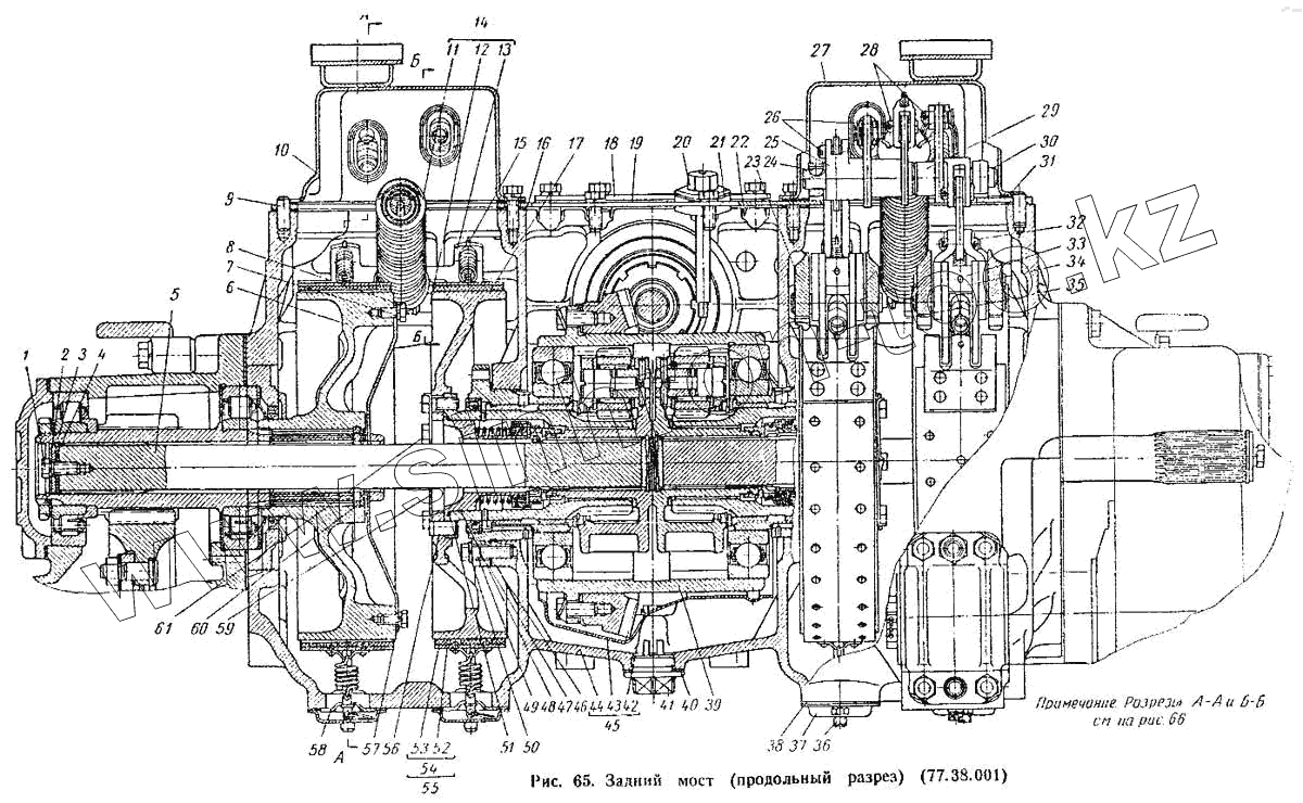 Каталог запасных частей к технике: ВгТЗ ДТ-75М. Задний мост (продольный разрез) (77.38.001)