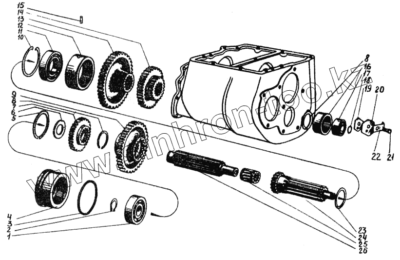 Каталог запасных частей к технике: ВгТЗ ДТ-75МВ. Ходоуменьшитель. Вал промежуточный и резервных скоростей