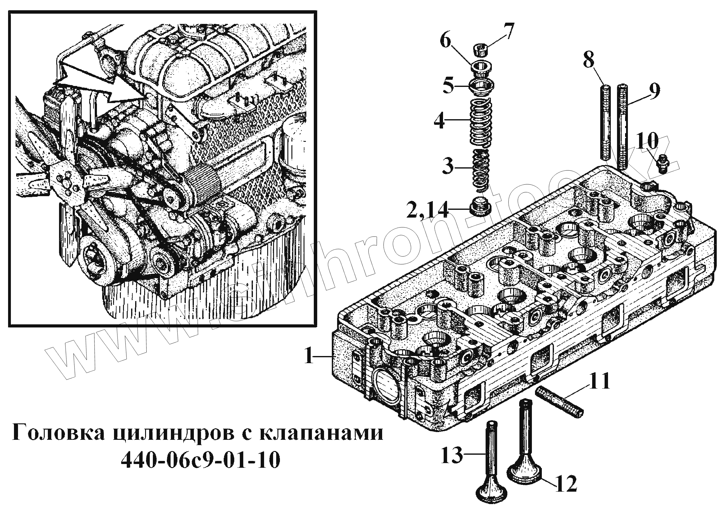 Каталог запасных частей к технике: ВгТЗ ВТ-100Д. Головка цилиндров с клапанами 440-06с9-01-10