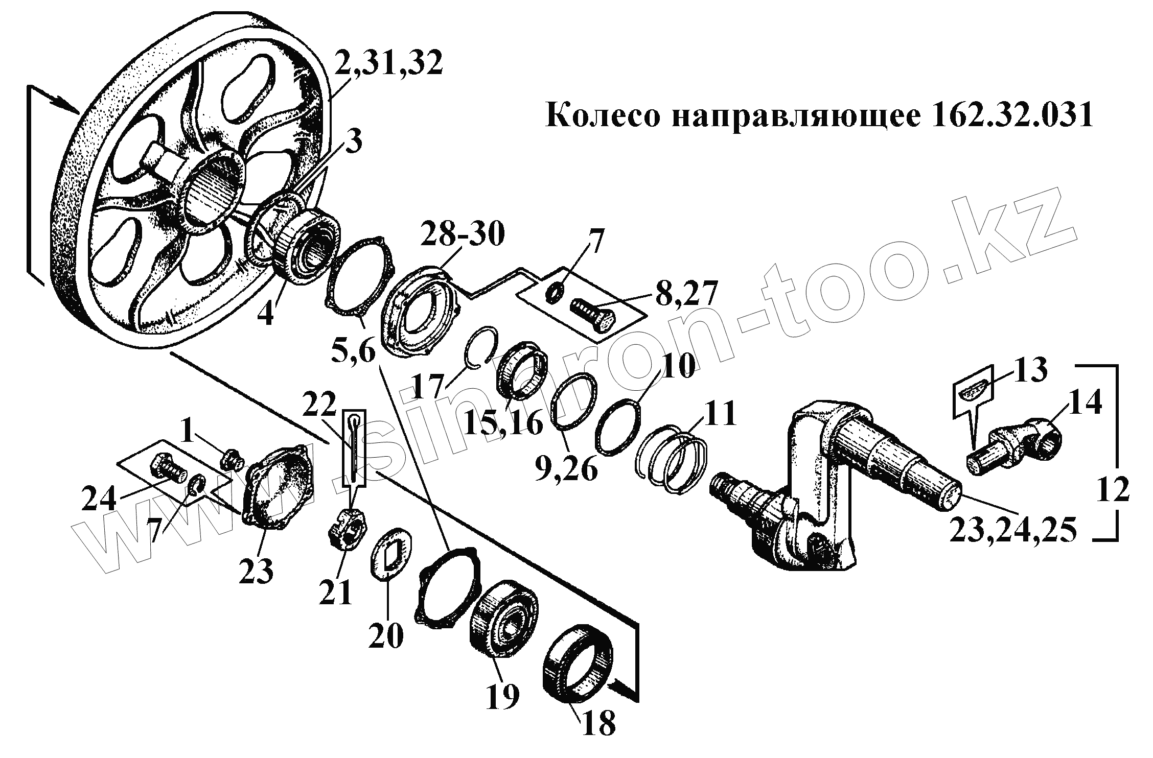 Каталог запасных частей к технике: ВгТЗ ВТ-100Д. Колесо направляющее 162.32.031 (1)