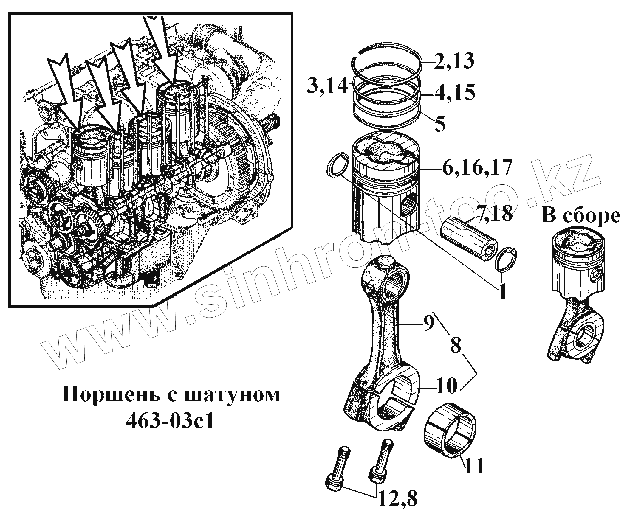 Каталог запасных частей к технике: ВгТЗ ВТ-100Д. Поршень с шатуном 463-03с1