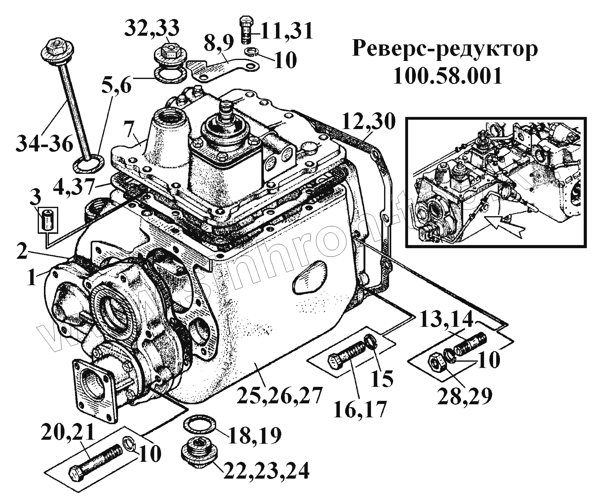 Каталог запасных частей к технике: ВгТЗ ВТ-100Д. Реверс-редуктор 100.58.001 (1)
