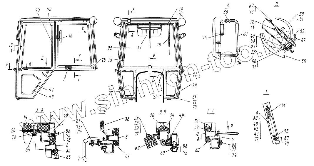 Каталог запасных частей к технике: ЮМЗ-6КЛ, (6КМ). Кабина. Каркас. Рамка задняя. Крыша. Двери