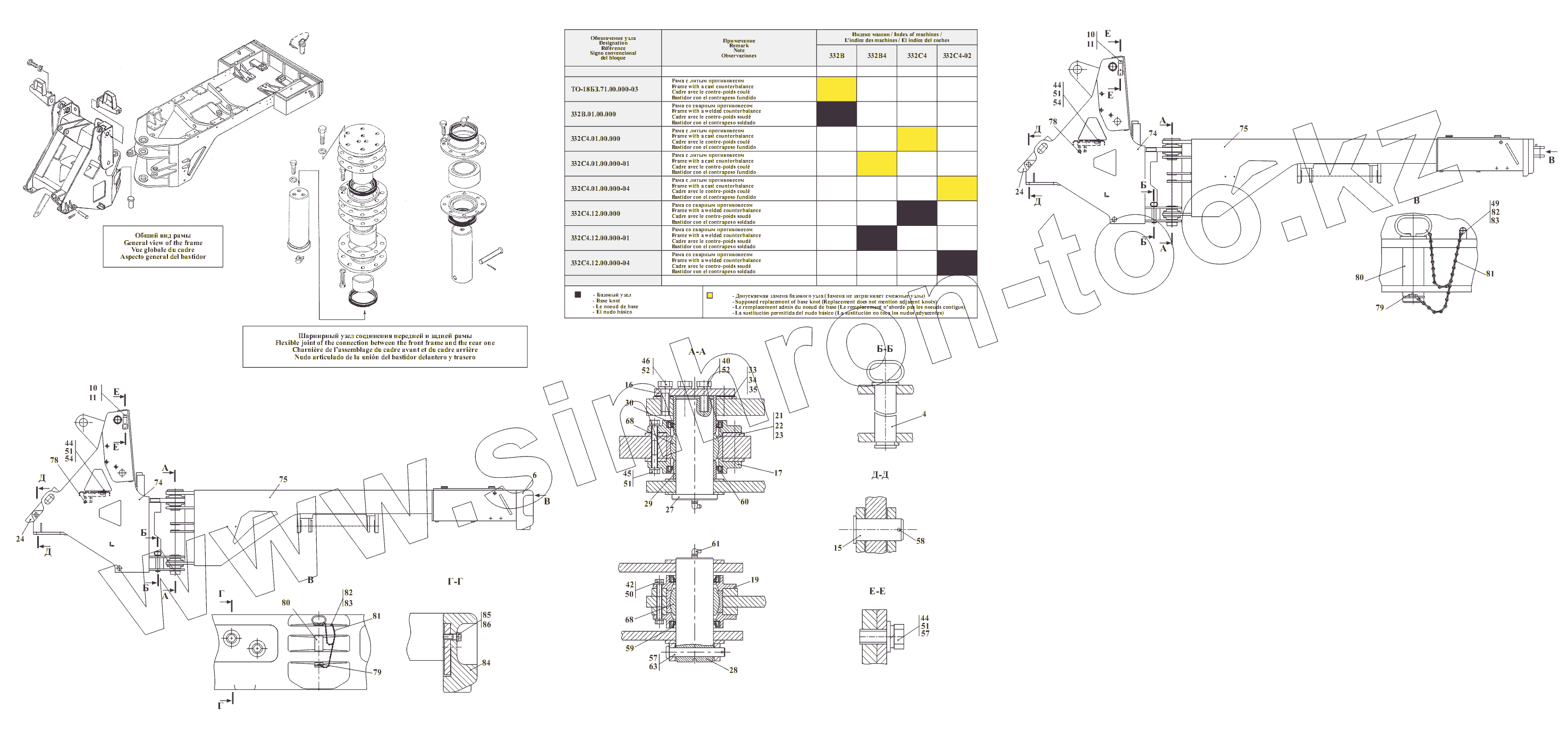 Каталог запасных частей к технике: Амкодор-332B, 332B4. Сводная таблица комплектации применяемых рам