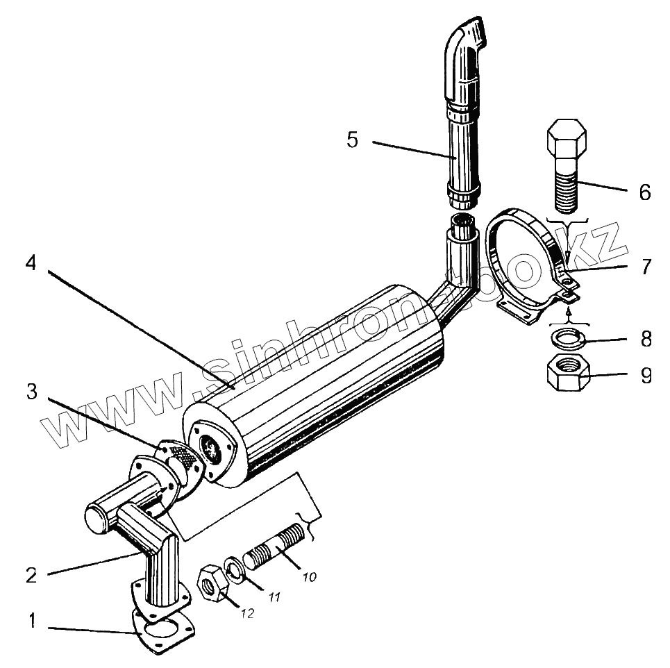 Каталог запасных частей к технике: Амкодор-333 (ТО-18Б). Установка глушителя