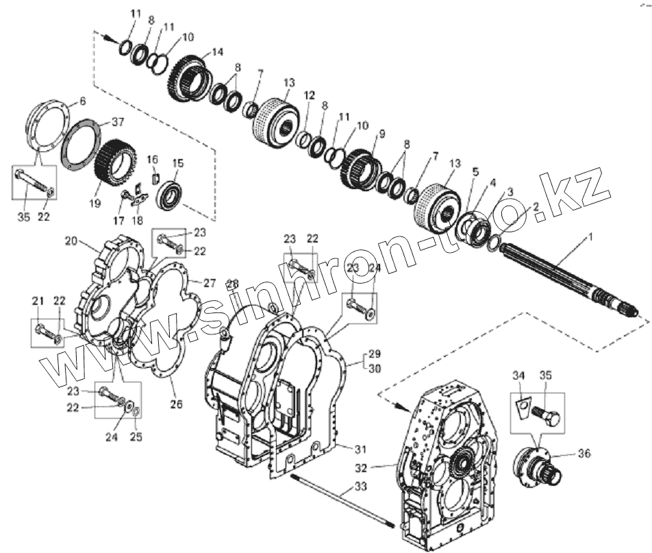 Каталог запасных частей к технике: БелАЗ-7822. Коробка передач. Картеры, установка первичного вала
