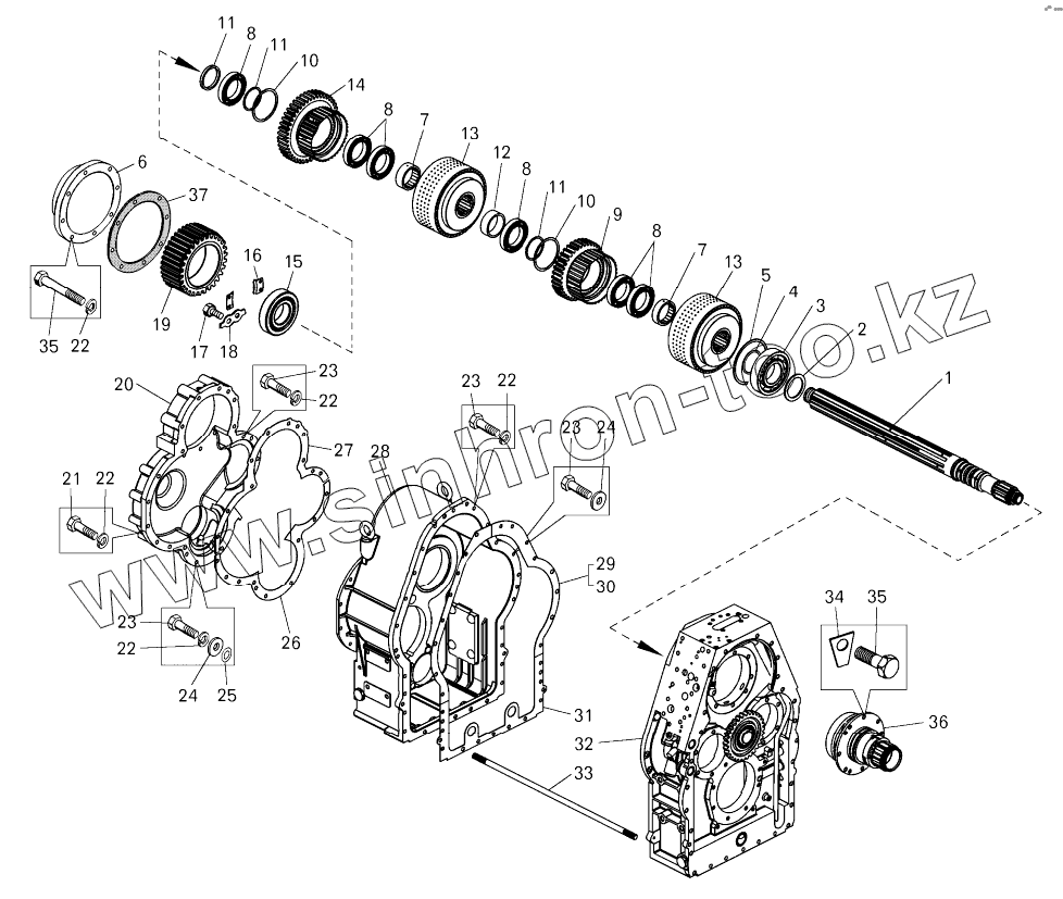 Каталог запасных частей к технике: БелАЗ-7822. Коробка передач. Картеры, установка первичного вала
