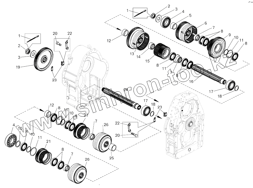 Каталог запасных частей к технике: БелАЗ-7822. Коробка передач. Установка реверсивного и диапазонного валов