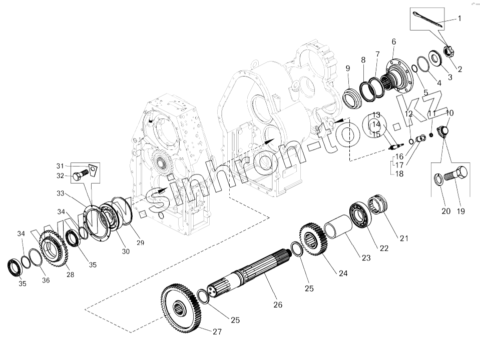 Каталог запасных частей к технике: БелАЗ-7822. Коробка передач. Установка выходного вала
