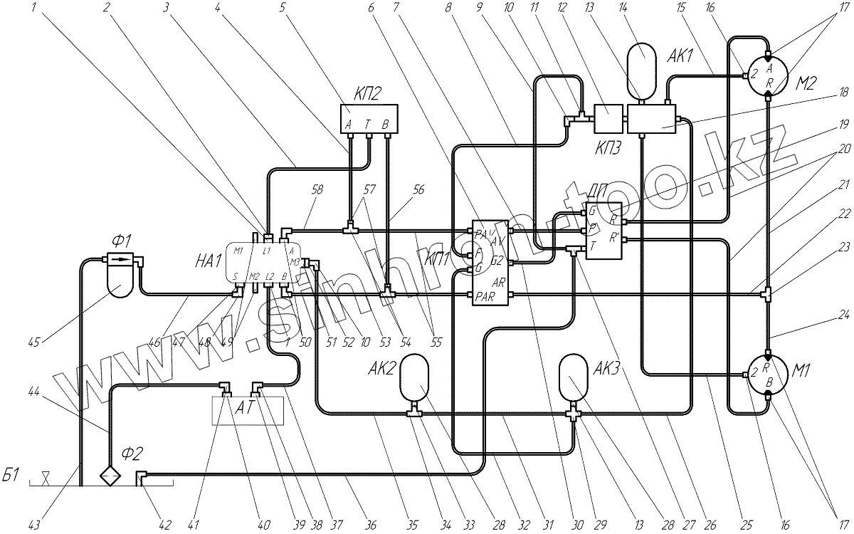 Каталог запасных частей к технике: Брянский Арсенал TG-250. Схема гидравлическая соединений. Гидросистема переднего моста