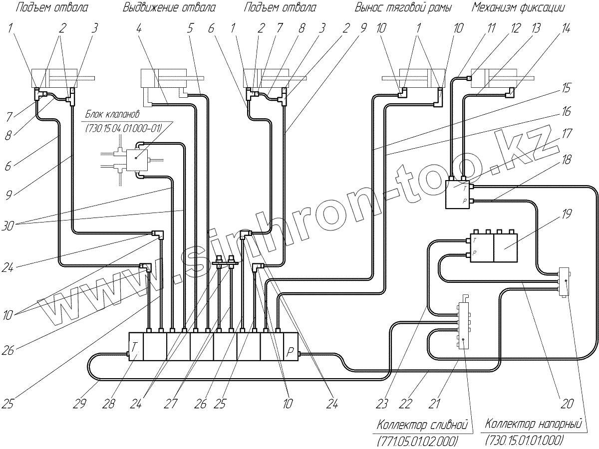 Каталог запасных частей к технике: Брянский Арсенал TG-250. Схема гидравлическая соединений. Гидросистема рамы передней
