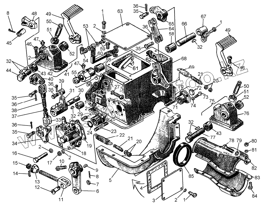 Каталог запасных частей к технике: ЧТЗ Т-10М. Механизм управления муфтой сцепления и стояночным тормозом