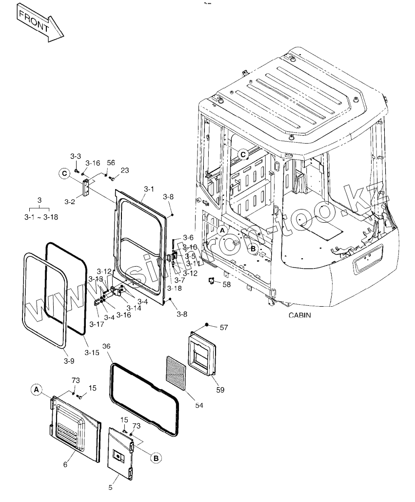 Каталог запасных частей к технике: Doosan DL220. CABIN (4) - DOOR ASSY (R.H)